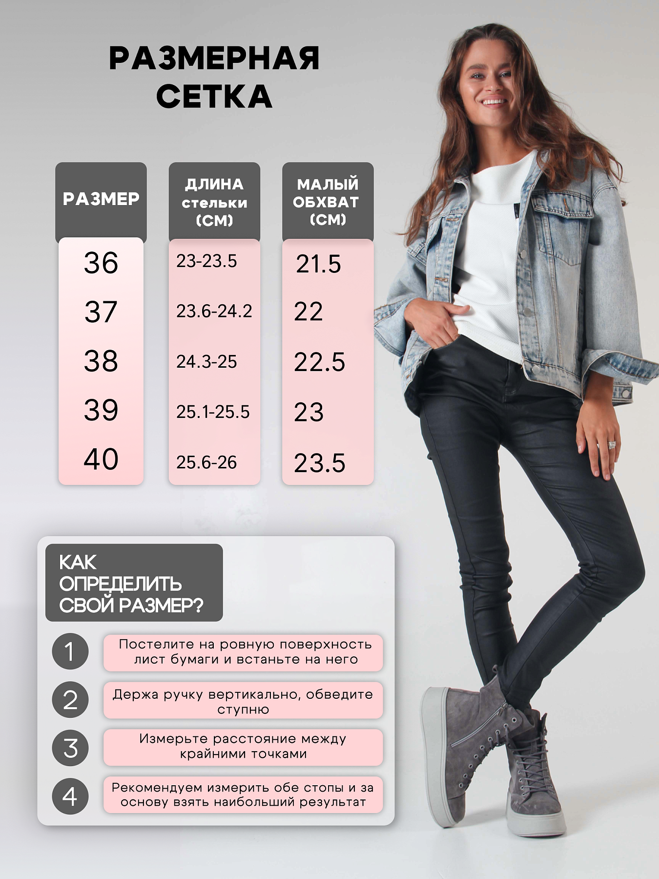 | Длина стопы | 23-23.5 | 23,6-24.2 | 24,1-25 | 25,1-25.5 | 25,6-26 | 26,1-26,7 |