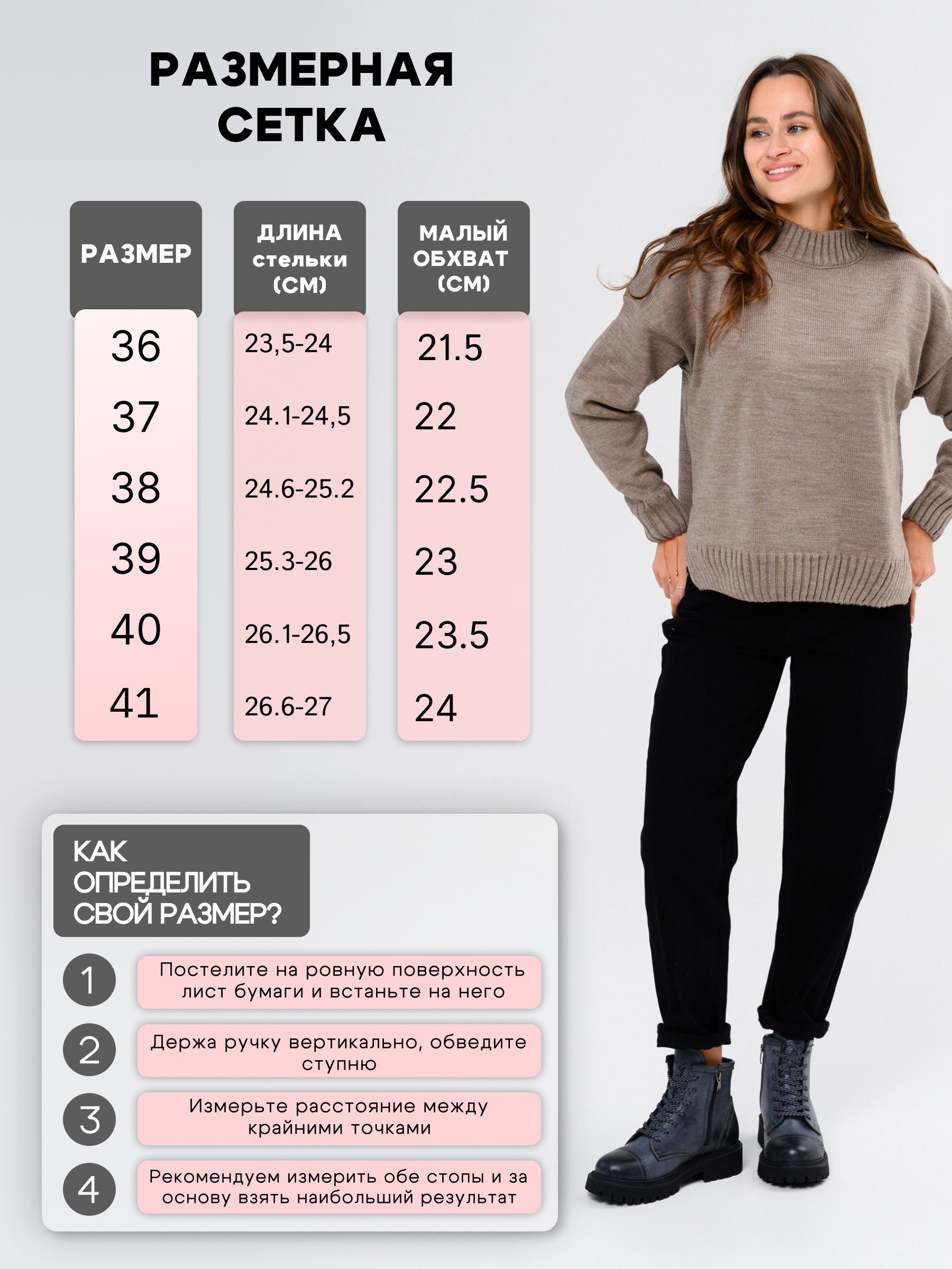| Длина стопы | 23,5-24 | 24,1-24.5 | 24,6-25.2 | 25,3-26 | 26,1-26.5 | 26,6-27 |