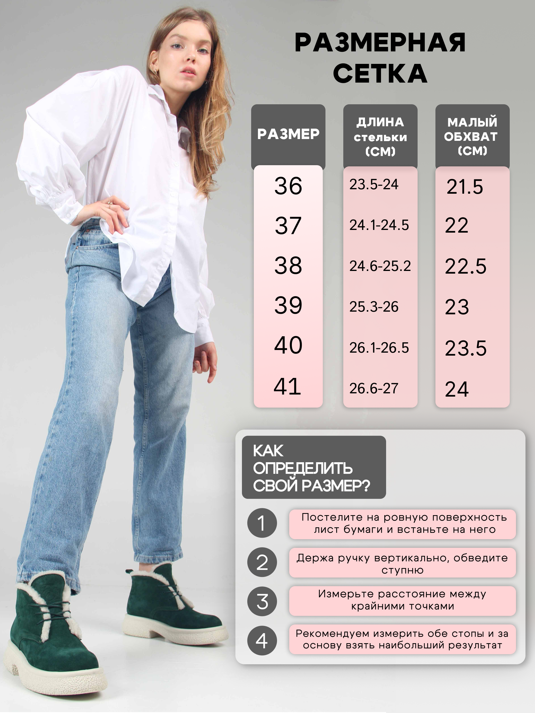 | Длина стопы | 23,5-24 | 24,1-24.5 | 24,6-25.2 | 25,3-26 | 26,1-26.5 | 26,6-27 |